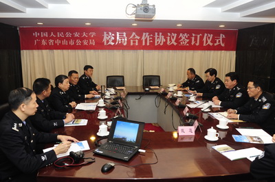 2015年11月13日上午,校党委副书记、校长曹诗权在木樨地校区会见广东省中山市人民政府副市长、公安局党委书记、局长谭培安一行,代表学校与中山市公安局签订校局合作协议。