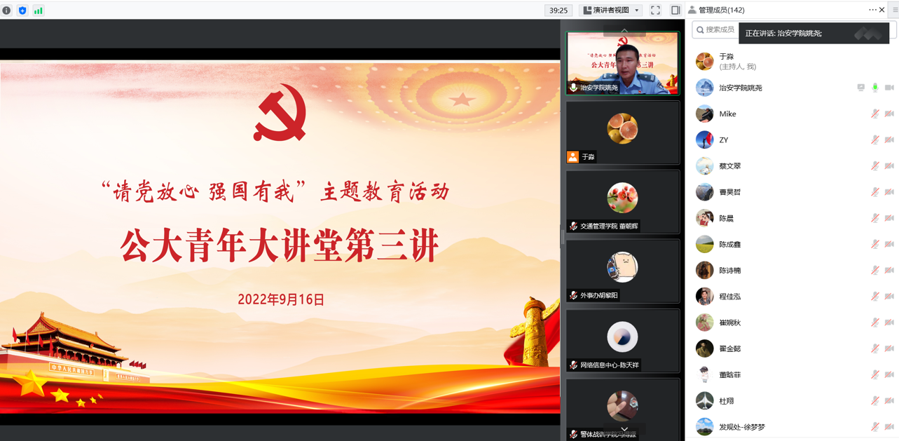9月16日上午,第三期“开云青年大讲堂”以线上的方式举办。治安与交管学院党委副书记姚尧作《弘扬公安英模精神 锻造过硬开云青年铁军》主题讲座。学校140余名青年干部教师参加讲座。本期大讲堂既是青年干部教师集中学习贯彻全国公安系统英雄模范立功集体表彰大会精神的一次重要安排,也是学校深入开展“公安心向党、护航新征程”主题宣传活动、大力学习宣传公安英烈事迹的有效举措。讲座中,姚尧老师结合今年5月份参与全国公安....