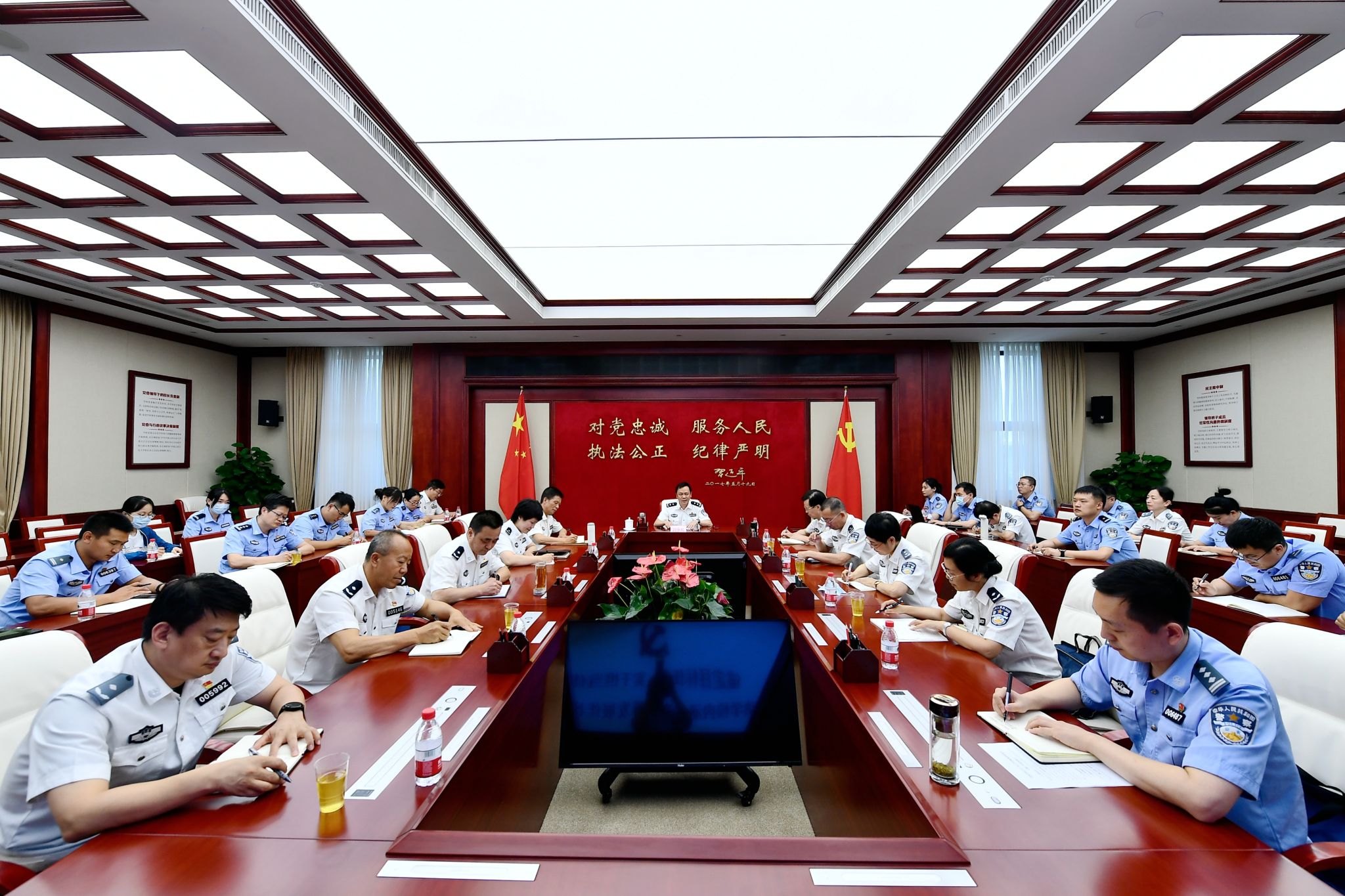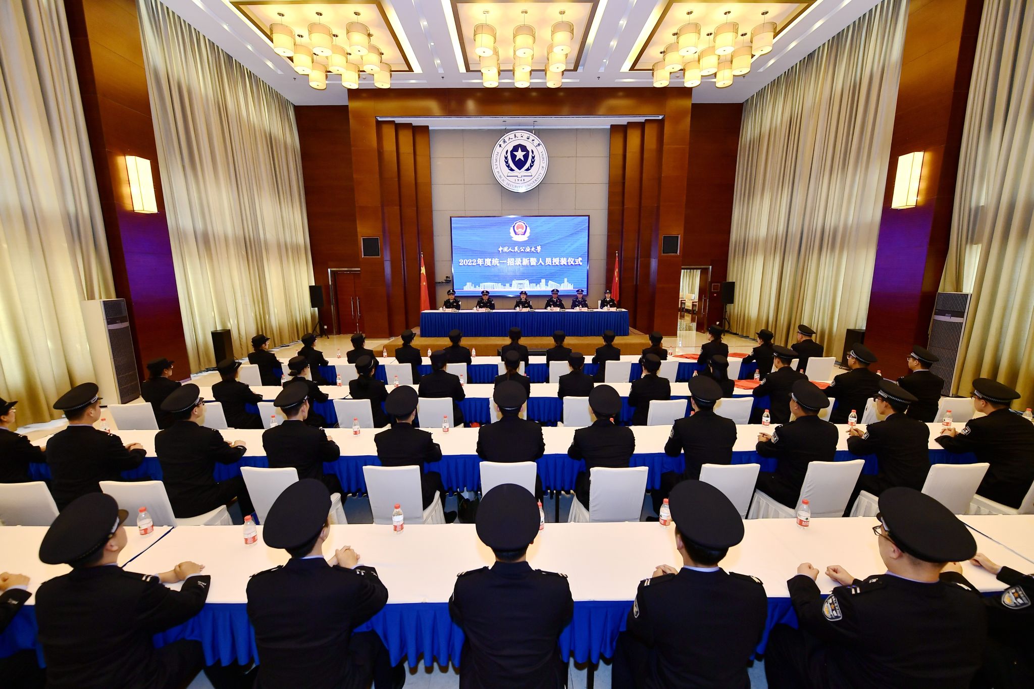 为进一步强化新入职干部教师的职业荣誉感和责任感,2023年7月6日下午,学校隆重举行2022年度统一招录新警人员授装仪式。校党委书记曾海燕出席仪式并作讲话,校党委副书记刘宇鹏主持仪式,校党委委员、副校长闫天池,校党委委员、副校长李克美,校党委委员、纪委书记刘文君,总会计师于玲出席仪式。学校隆重举行2022年度统一招录新警人员授装仪式仪式在庄严的国歌声中拉开序幕。闫天池副校长宣读授装决定,校领导向新入职干部教...