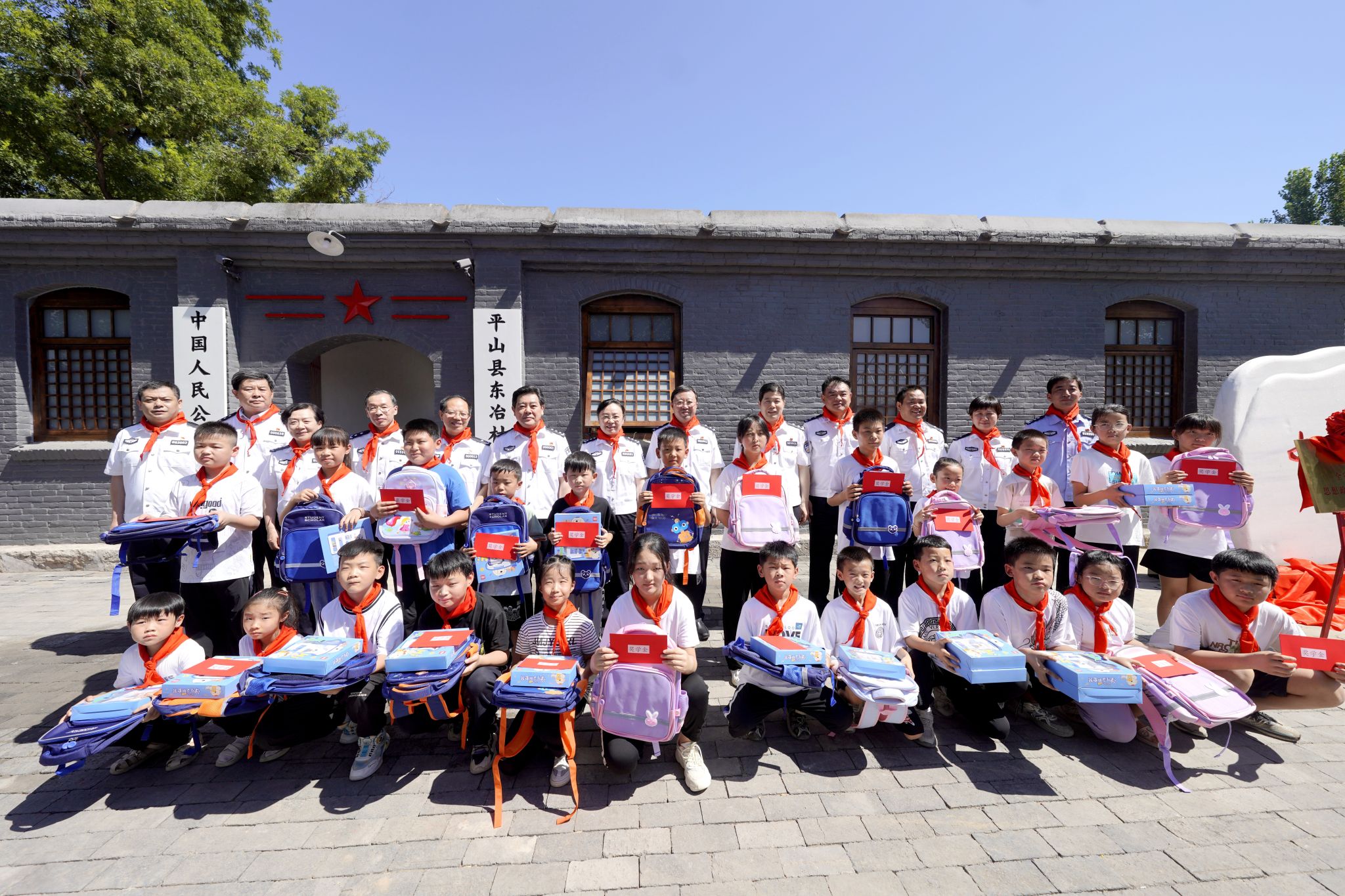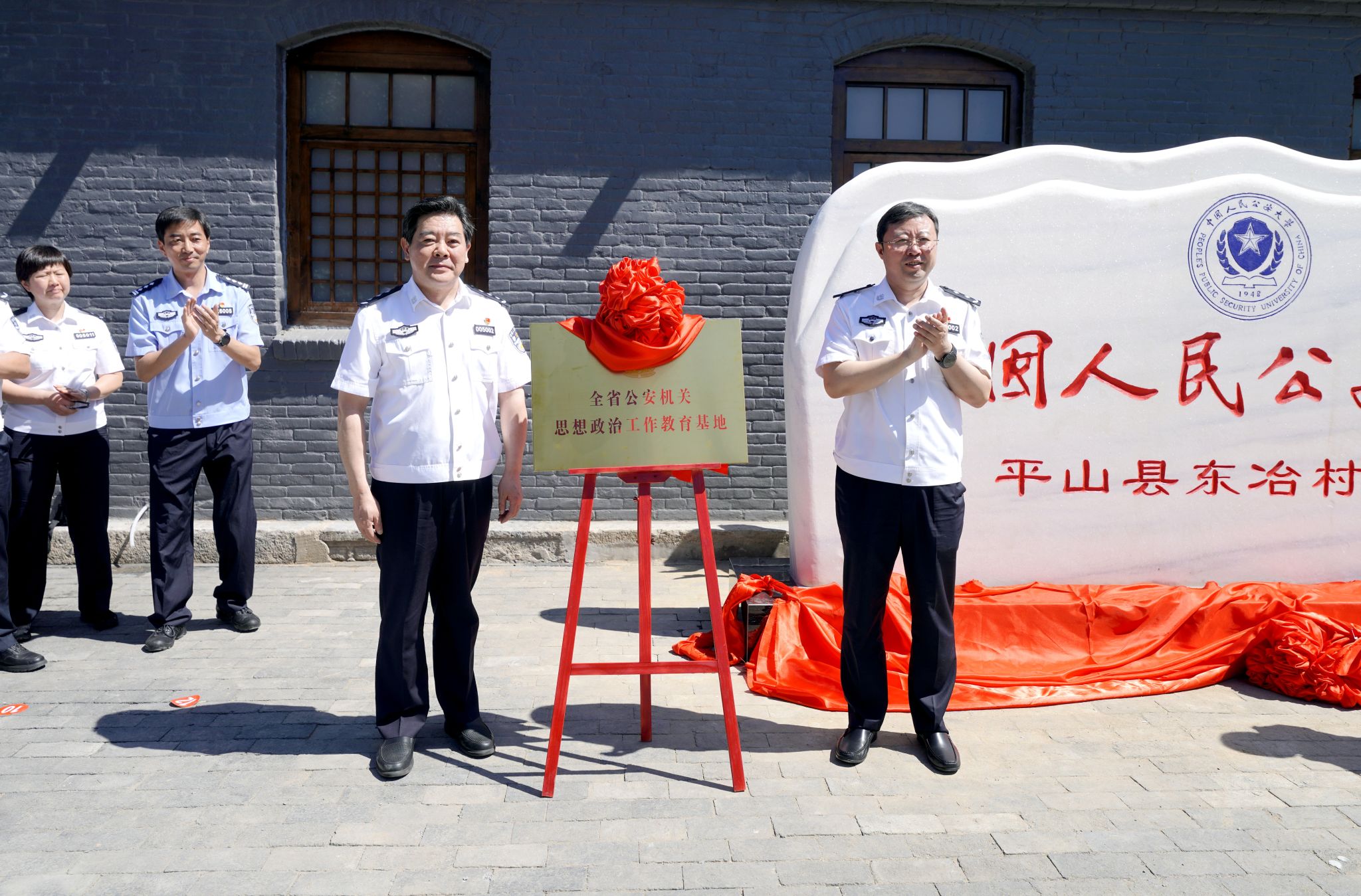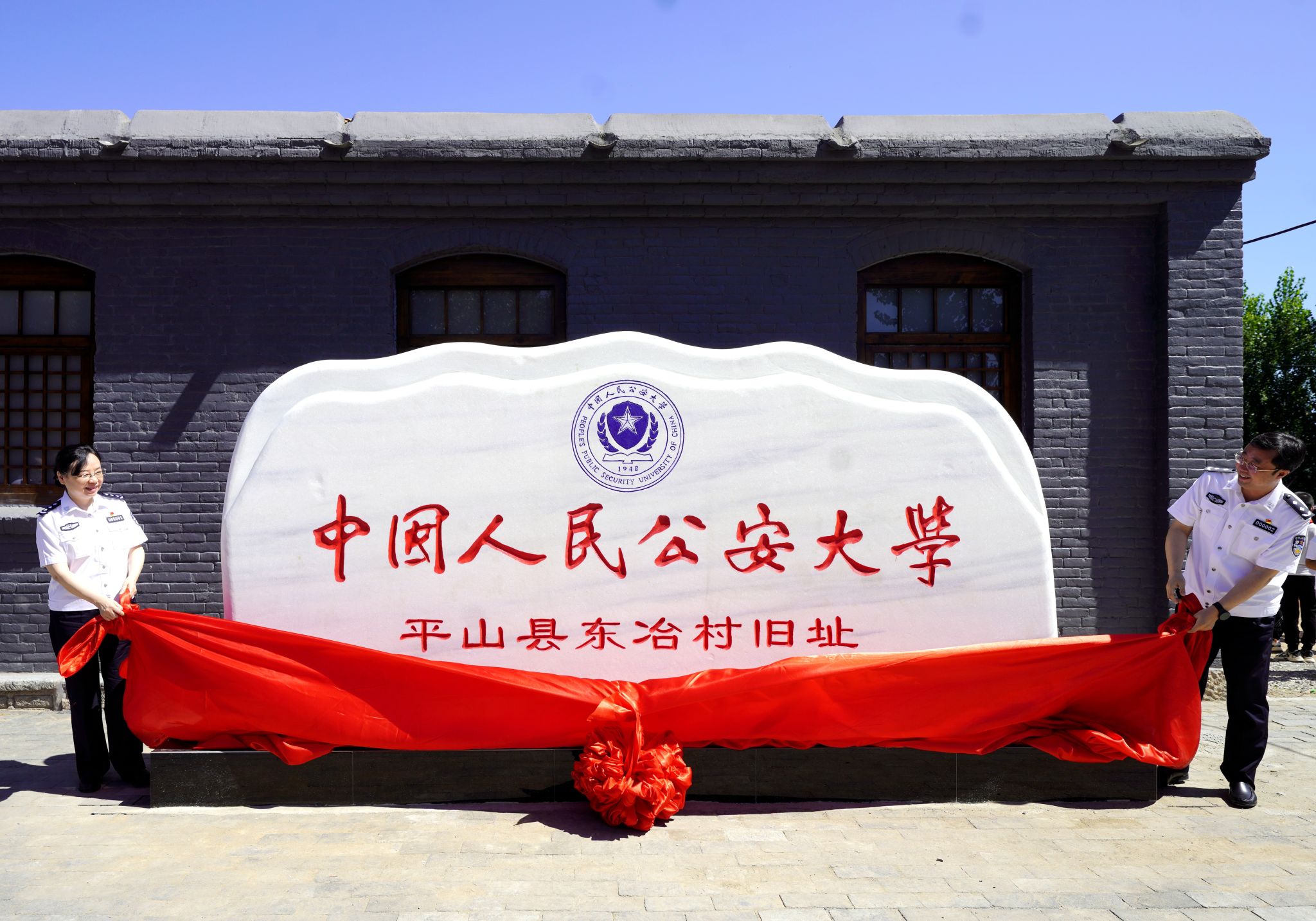 校党委书记曾海燕和河北省公安厅党委副书记、常务副厅长赵韶峰共同为公安大学平山县东冶村旧址纪念碑揭幕。