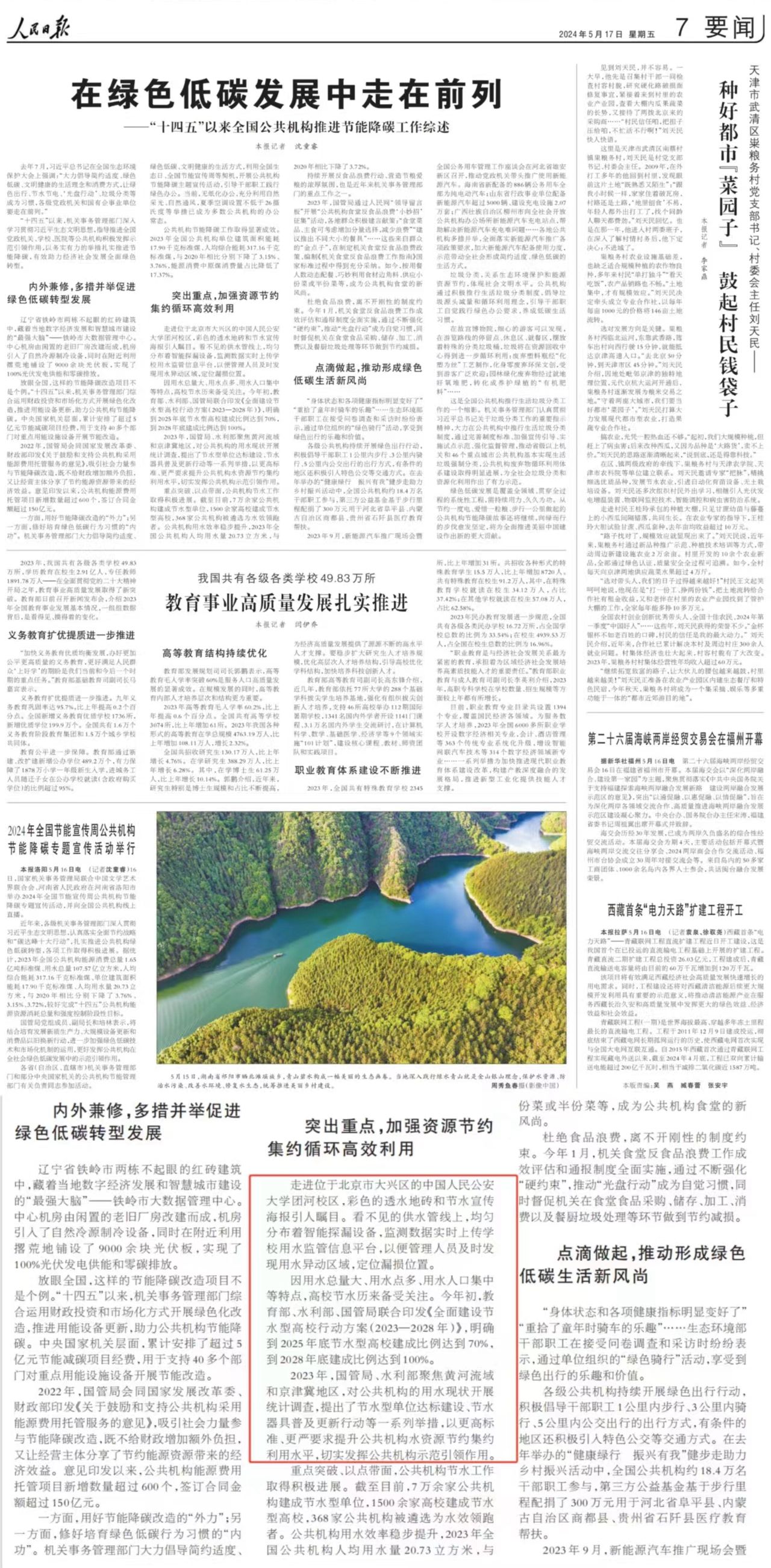 《人民日报》刊发文章《在绿色低碳发展中走在前列——“十四五”以来全国公共机构推进节能降碳工作综述》,文中以开云节水工作为例,倡导公共机构以更高标准、更严要求提升水资源节约集约利用水平,切实发挥公共机构示范引领作用。