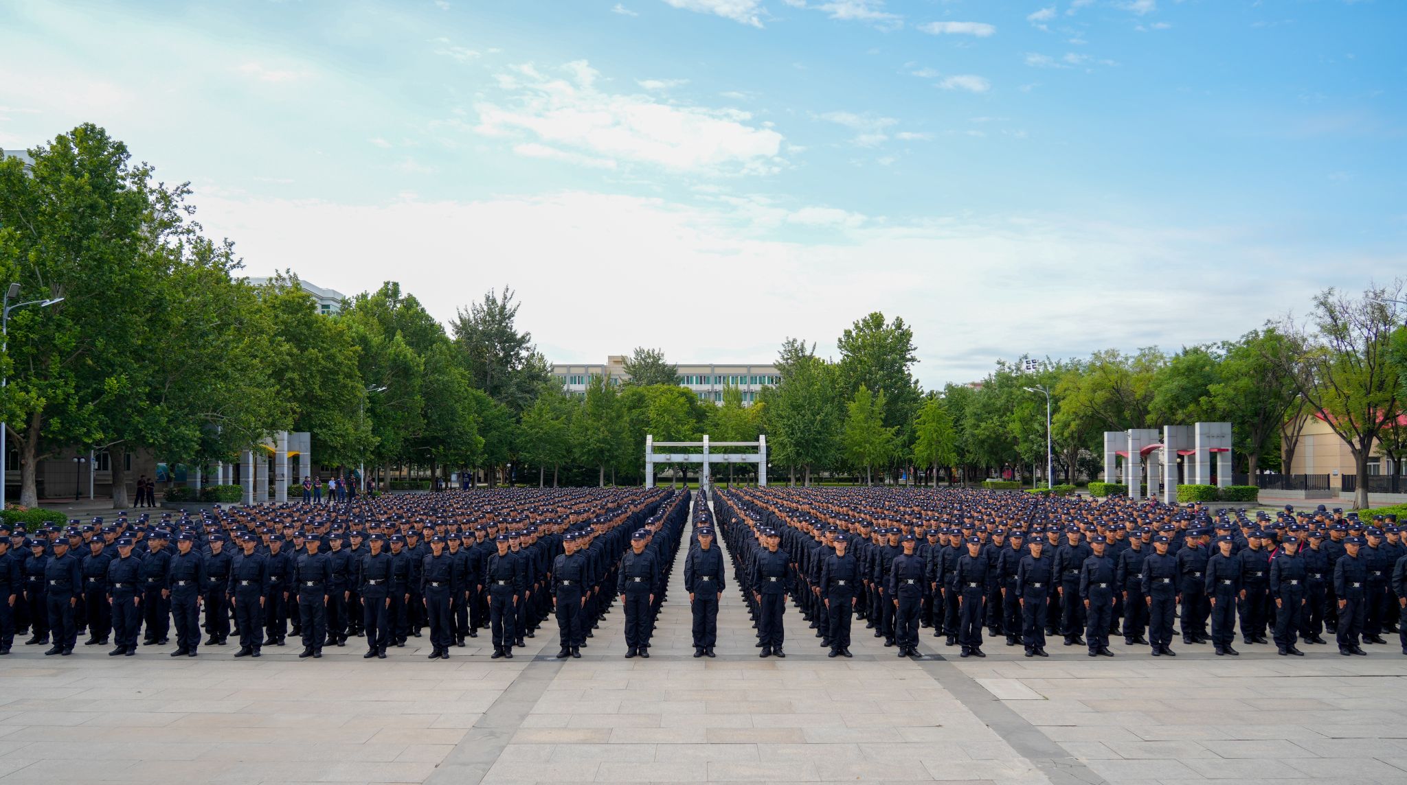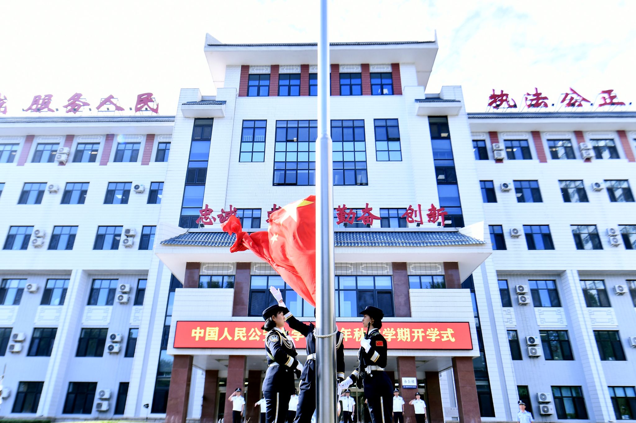开学式上,举行了隆重的升国旗仪式。涉外警务学院2021级本科生杨竣尧同学、国家安全学院副院长李丽华教授分别发言,表达了在新学期保持奋进姿态、以优异成绩向新中国75周年华诞献礼的坚定决心。校属各单位班子成员和3000余名师生代表共同参加开学式。