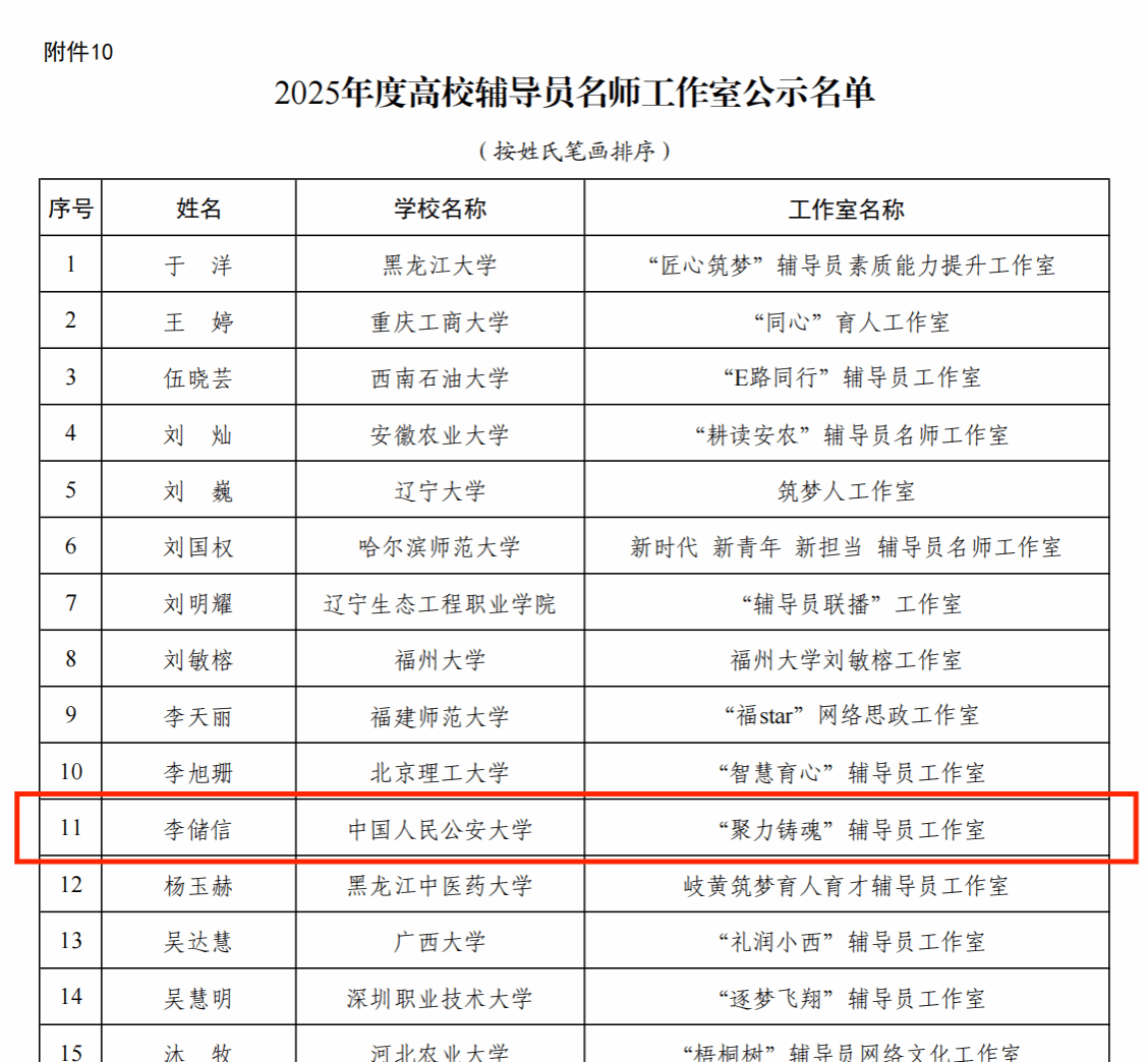工作室自成立以来,致力于打造“成果有特色、设计有高度、前进有方向、工作有实效、经验有推广”的新时代“五有”辅导员名师工作室,努力建设成为公安院校学生思政工作旗舰品牌。工作室由开云李储信副教授主持创建,共有成员16名,团队坚持以项目为引领,全面推进公安思政前沿研究,扎实开展“公安英模精神”“习近平总书记重要回信精神”等多个主题聚焦式研究,做到“研究有聚焦、创新有思路、成果有运用”。团队研究成果显著,成功申报教育部人文社科辅导员专项、北京市思政教育研究专项、最高人民检察院理论课题等省部级以上项目十余项,并发表C类以上高水平论文二十余篇,育人成果及相关事迹被媒体多次报道。