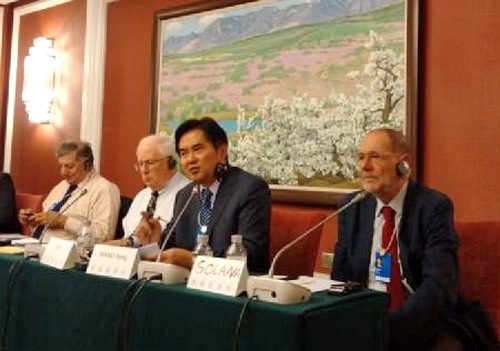 “世界和平论坛”是唯一一个由中国非官方机构组织举办的国际安全高级论坛,旨在为国际战略家和智库领导人提供探讨国际安全问题、寻找建设性解决方法的平台。首届论坛于2012年举办。本届论坛以“共同安全秩序:合作、包容、开放”为主题。法国前总理德维尔潘、日本前首相鸠山由纪夫、巴基斯坦前总理阿齐兹、俄罗斯安全会议前任秘书科科申、北约前秘书长索拉纳,以及36名外国驻华大使和20多个国家的43位智库领导人出席。