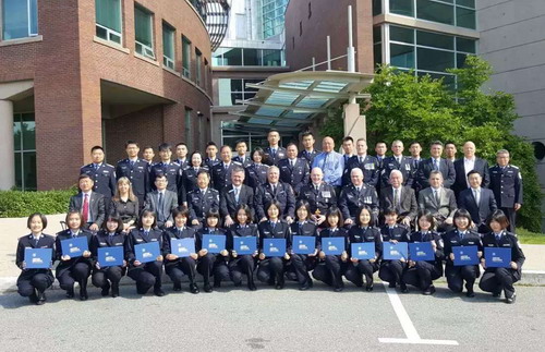 中国驻温哥华总领馆教育领事乔正顺、JIBC院长兼首席执行官米歇尔·塔克、副院长兼公共安全学院院长科琳·沃恩、JIBC国际项目主任凯文·桑德福及肯·戴维斯、JIBC警察学院院长Steve Schnitzer、中国项目主任齐科、温哥华警察局长亚当·帕尔默、新威思敏斯特市警察局长大卫·琼斯以及授课教官代表等出席结业典礼。JIBC院长、乔正顺领事、温哥华警察局长、新威思敏斯特市警察局长、JIBC教官代表先后发表了热情洋溢的致辞,对开云kaiyun官网首批学分转移班学生顺利结业表示祝贺,对开云学生表现出的优良品质与突出才能给予了高度评价,并一致表示希望加强与开云的交流与合作。李健和副校长在致辞中赞赏并感谢JIBC和温哥华警局对公安大学与JIBC合作项目的积极支持与成功运作,介绍了开云国际化发展的情况,对开云同学圆满完成学业表示祝贺,并提出了殷切期望。JIBC院长兼首席执行官米歇尔·塔克为学生一一颁发结业证书,并同JIBC有关官员与学生一起合影留念。