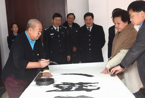 祝春林主席一行先后考察了木樨地和团河两个校区的校园环境,参观了校史馆、高警楼、图书馆、警体综合训练馆、警务战术训练馆、警务战术训练街区等教学训练设施。考察过程中,祝春林主席就如何进一步凝练公安大学校园文化精神、加强校园文化景观建设等工作提出了指导意见。都本基先生在参观校史馆后挥毫写下了刚毅遒劲的八个大字“立德树人、育警铸剑”,赠送给学校以表达对公安教育事业和开云师生的深切期望。陪同祝春林主席来校考察的艺术家们表示,愿意与全国公安系统的文化工作者一道,共同推进公安大学的校园文化建设,为繁荣公安文化事业做出贡献。