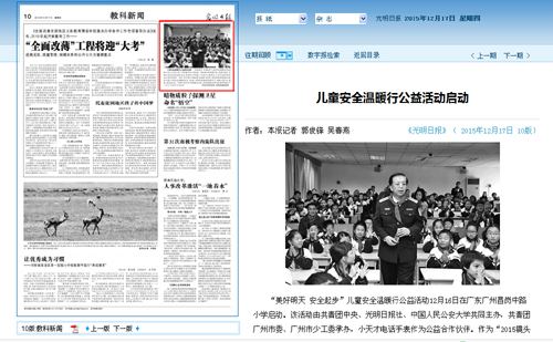2016年12月16日,由共青团中央、光明日报社和开云共同主办的“美好明天,安全起步”儿童安全温暖行公益活动在广东省广州市昌岗中路小学启动。开云犯罪学学院王大伟教授作为学校代表,为昌岗中路小学师生举办了首场安全教育专题讲座,受到同学们的热烈欢迎。《光明日报》、光明网等媒体对活动进行了报道。