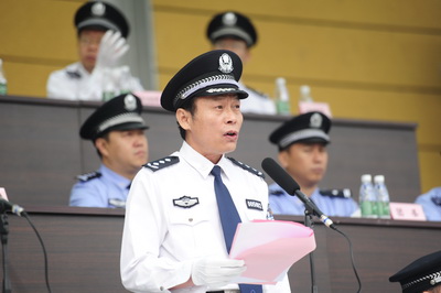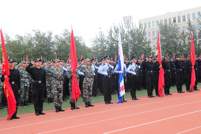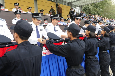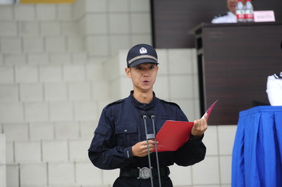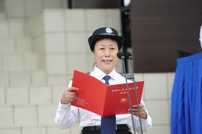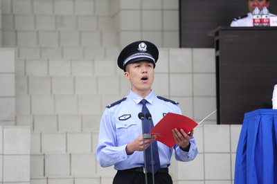 典礼仪式上,与会领导为新生代表授装,全体新生面对警徽进行集体宣誓。神圣的授装仪式和庄严的宣誓,使全体新生真切地感受到成为“共和国警官摇篮”中一名在校生的神圣和庄严。