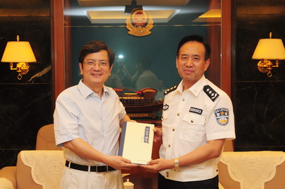 程琳校长向郑强校长赠送《公安学通论》一书