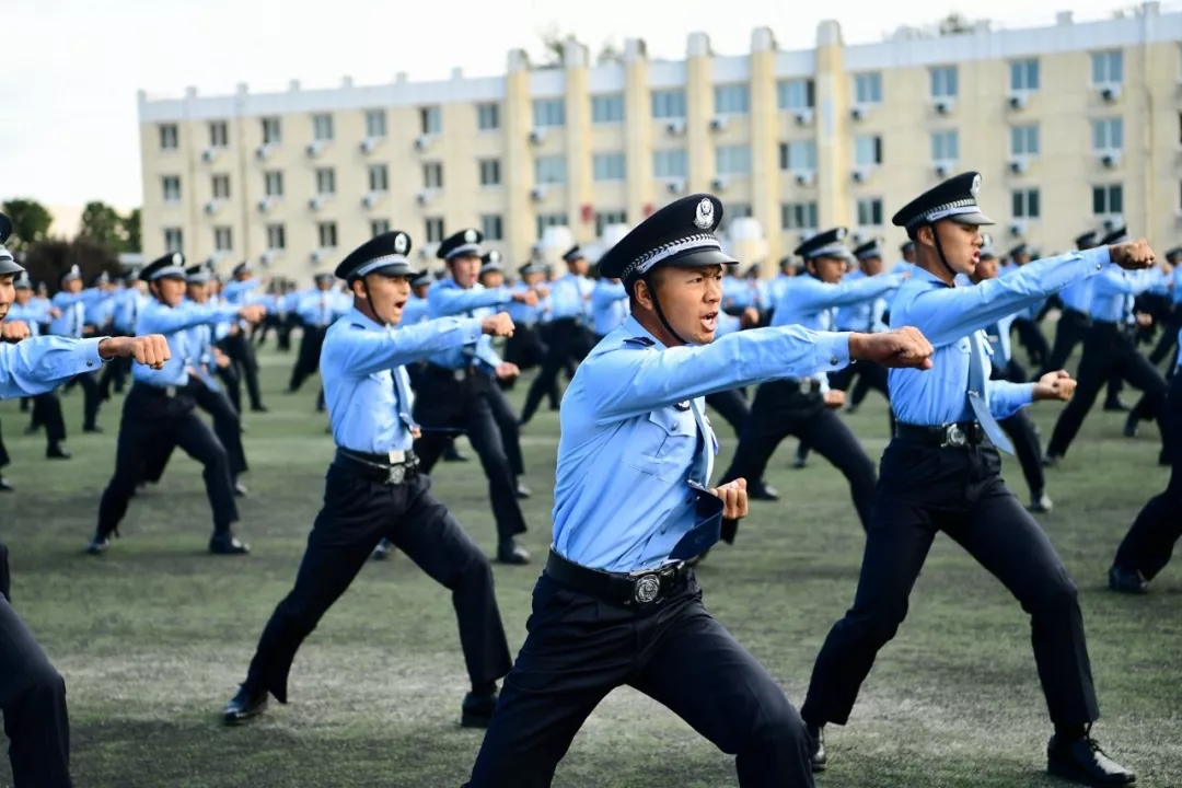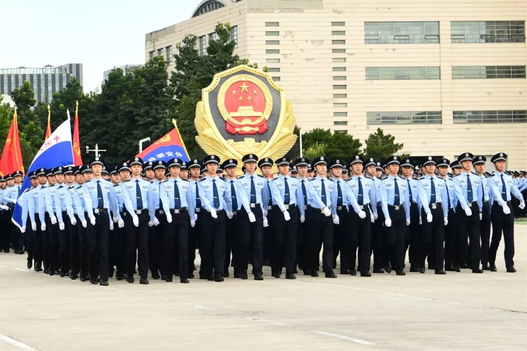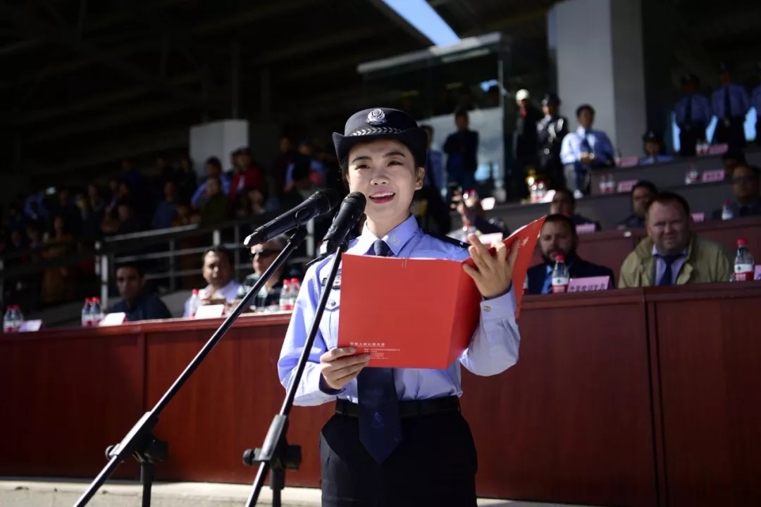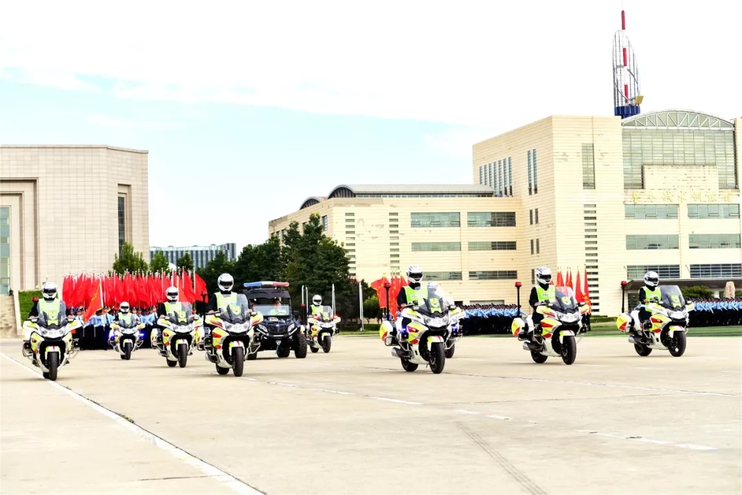 上午10:30,汇报表演在雄壮的国歌声中拉开帷幕。由9辆警用摩托车和2辆警用全地形车组成的护卫方队开道,在党旗、国旗方队的引领下,3134名新生和来自10个国家的29名外国警察留学生组成的23支受阅方队依次通过主席台接受检阅。整齐划一的队列、铿锵有力的步伐、果敢坚毅的眼神、豪气冲天的口号,是整整一个月警务化训练的成果,也是他们成为共和国预备警官的第一份考试成绩单!720名本科新生表演的擒敌拳阵形严整、号令统一、动作有力、气势威武,赢得了主席台和观礼台上一阵阵热烈的掌声。