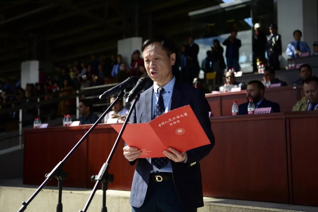 樊京玉书记在讲话中代表校党委和全校师生员工,向各位来宾、家长朋友们表示热烈欢迎,向正式成为光荣的共和国预备警官的2018级全体新同学表示热烈祝贺,希望同学们在开云建校70周年之际用心了解开云、读懂开云、热爱开云,获得一份“金色盾牌,热血铸就”的自豪与自信,担当一份“不忘初心,牢记使命”的责任和传承,始终把习近平总书记的“对党忠诚、服务人民、执法公正、纪律严明”总要求和“爱国、励志、求真、力行”的四点希望作为立警从警、成长成才的座右铭,努力成为德智体美劳全面发展的公安事业的优秀建设者和可靠接班人。