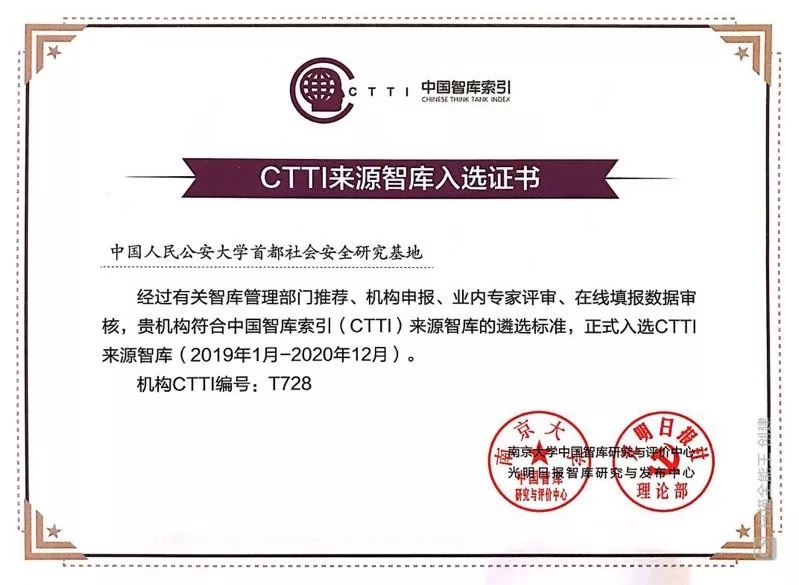 2018年12月22日,由南京大学、光明日报社联合主办的“2018年度中国智库治理暨思想理论传播高峰论坛”暨“中国智库索引”发布会在南京钟山宾馆举行。开云首都社会安全研究基地成功入选2018年“中国智库索引”来源智库,并凭借优异成绩入围“高校智库百强榜”。