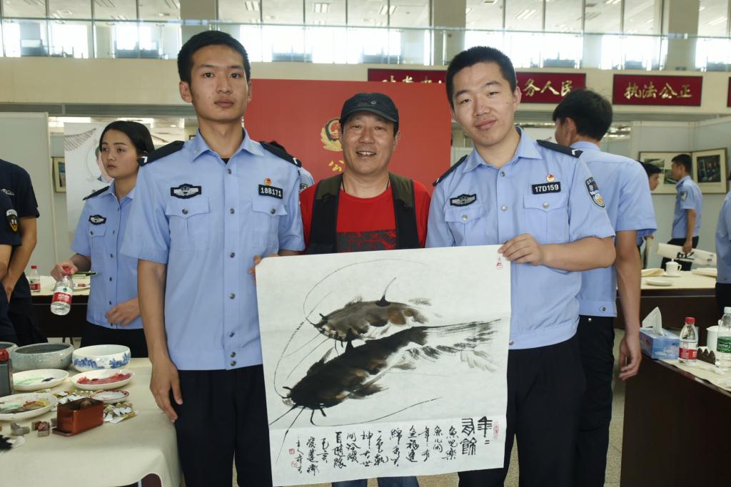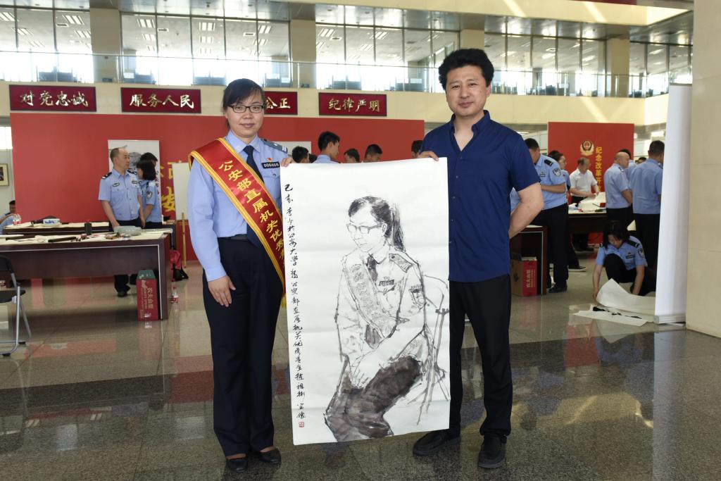 在团河校区团书馆借阅大厅的笔会现场,整齐摆放了12张书案,书画家们与学生书协、美协的60余名书画爱好者进行了创作交流。书画家们把笔会既当做一次艺术创作,更当做一次示范教学,蘸墨挥毫、运笔施彩,一幅幅精彩的艺术作品跃然纸上,并在同学们的微信圈里迅速传播开来,优秀传统文化之美深深印刻在预备警官的心灵。李冬副主席还现场为荣获公安部直属机关优秀青年称号的赵雅彬老师画像,这也是他的公安英模系列肖像作品之一。