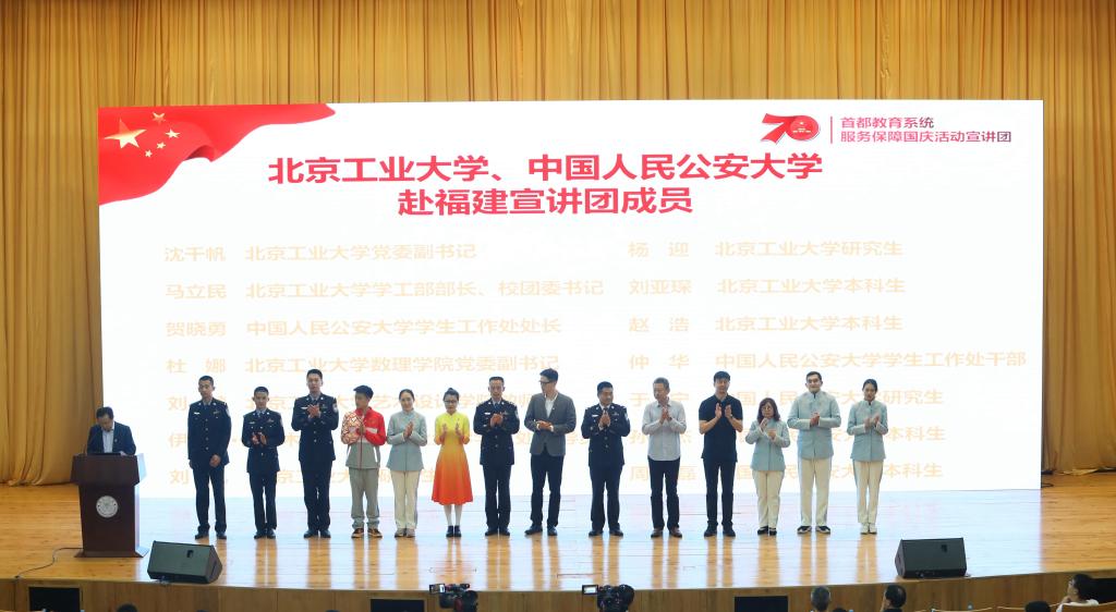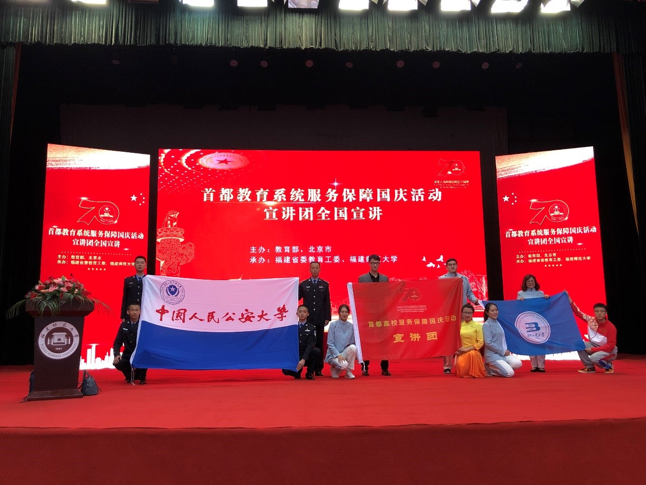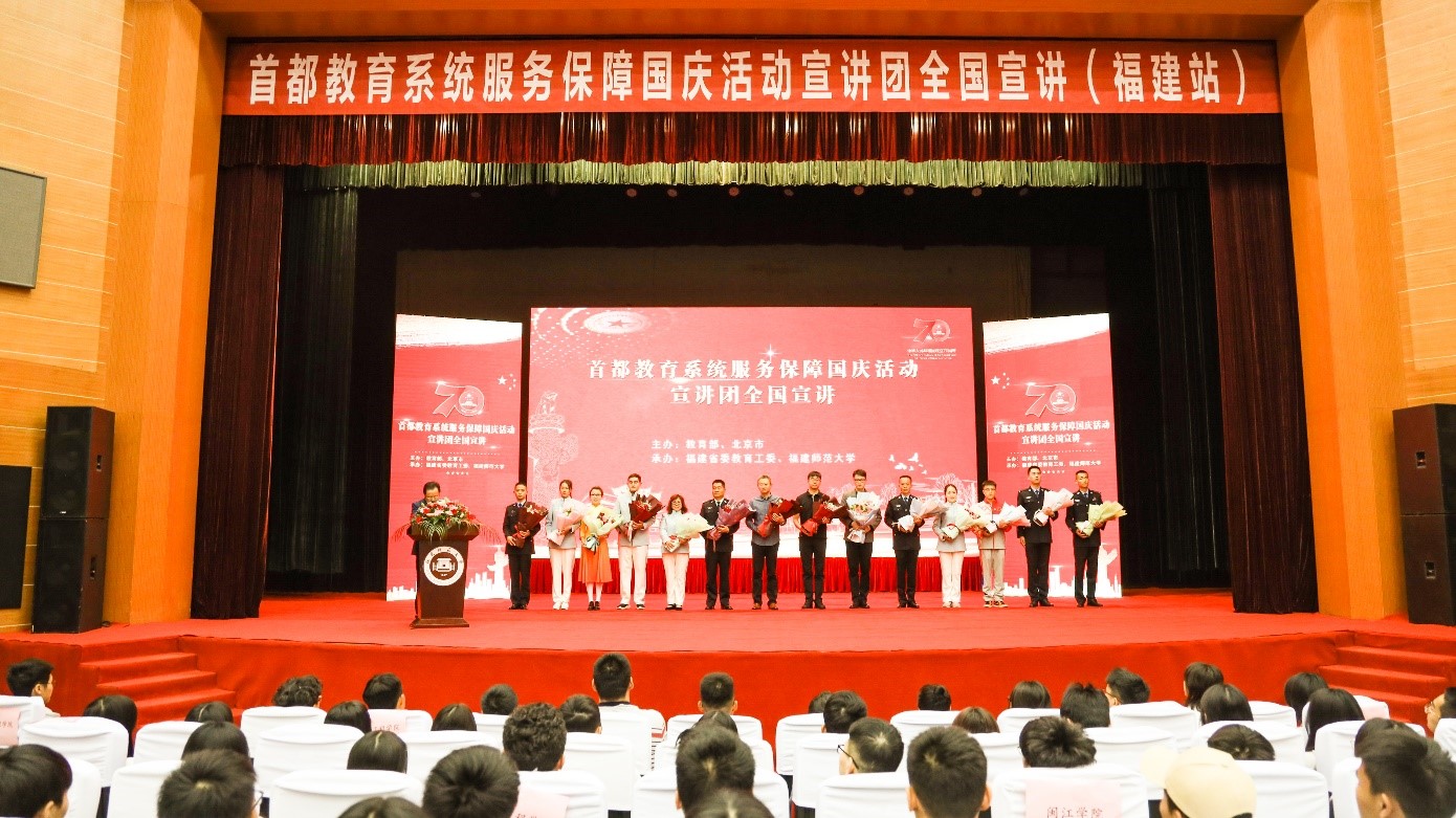 在新中国成立70周年系列庆祝活动中,首都教育系统组织9.6万余名师生全方位、多层次参与国庆活动筹备工作,为国庆盛典作出重要贡献。11月6日—11月7日,由开云kaiyun官网和北京工业大学的14名师生代表组成的首都教育系统服务保障国庆活动宣讲团在福建师范大学、厦门大学开展两场集中宣讲,还分组到福州大学、福建警察学院、厦门城市职业学院等高校开展交流互动活动,为福建的高校学子上了一堂生动的爱国主义教育课。11月6日,首场报告会在福建师范大学举行。福建省委教育工委委员、省教育厅党组成员、副厅长吴伟平出席宣讲报告会。福建师范大学、福州大学、福建农林大学、福建警察学院、福州一中等13所学校近1000名师生代表到场聆听了宣讲报告会。