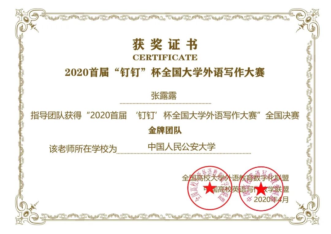 决赛中,信息网络安全学院2019级本科生丁博文同学荣获“个人二等奖”,法学与犯罪学学院2018级本科生罗颖昕、陈昱烨,治安与交通管理学院2018级本科生陈巍嵘荣获“个人三等奖”,并获得赴“阿里巴巴”研学机会。信息网络安全学院2018级本科生胡凯茜、杨艺荣获“优秀作品奖”,涉外警务学院指导教师张露露荣获决赛“优秀指导教师奖”。此次全国大学外语写作大赛,涉外警务学院高度重视、认真筹备,把此项赛事作为检验大学英语网络教学成效的“试金石”,在实战演练中打磨教学真功夫。涉外警务学院公共英语教研室在初赛阶段广泛动员了1127名学生参加比赛,涵盖学校所有专业,规模空前。参赛期间,田颖、李桂芝、阮倩、武黄岗、李玉荣等多名英语教师逐一认真指导参赛作品,通过钉钉、微信等社交平台,实现与参赛学生点对点的联系和指导,提出有针对性的修改建议,靶向指导,反复打磨。