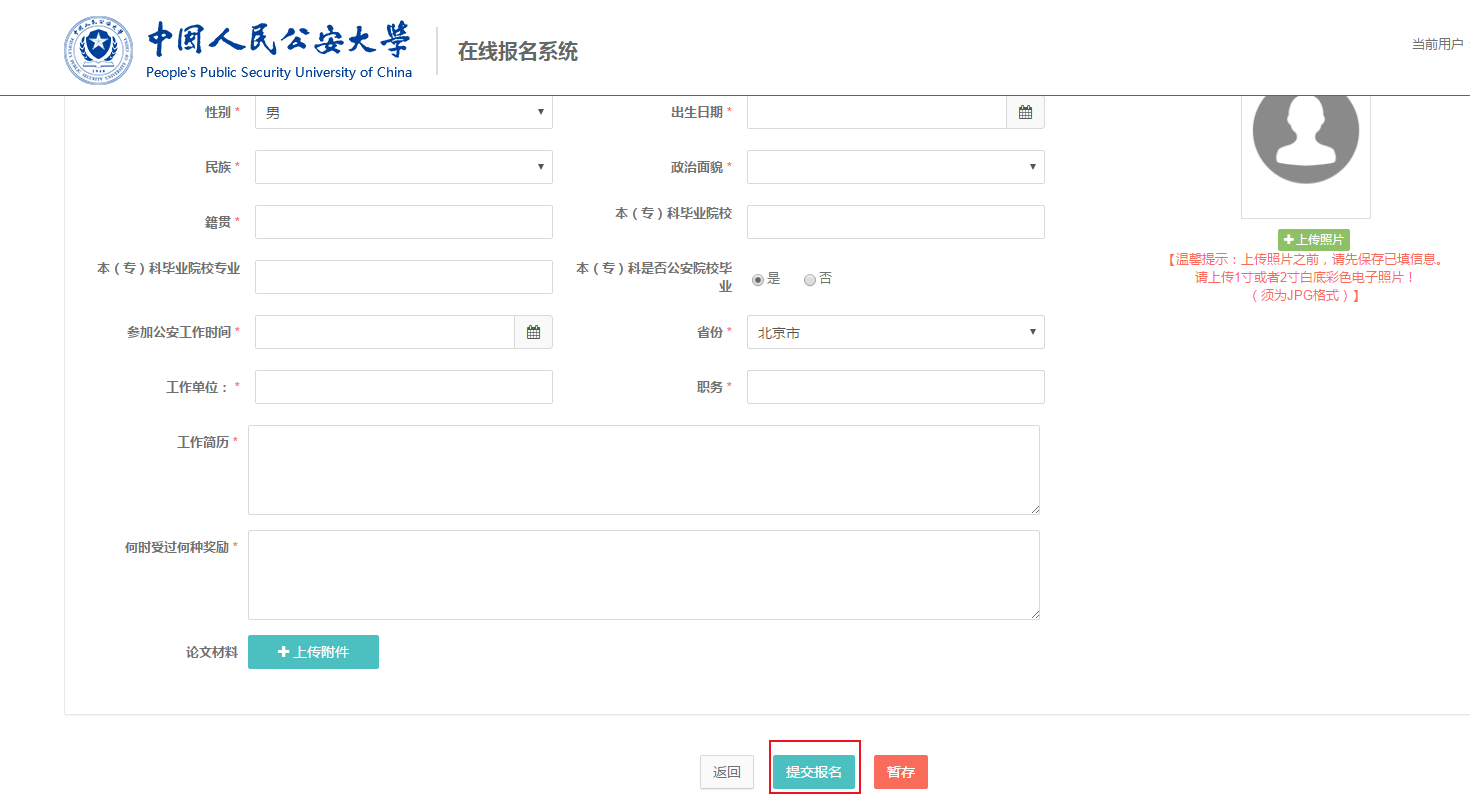 4、点击报名按钮,进入个人信息页面,填写个人信息后,点击提交报名,报名成功,如下图所示,: