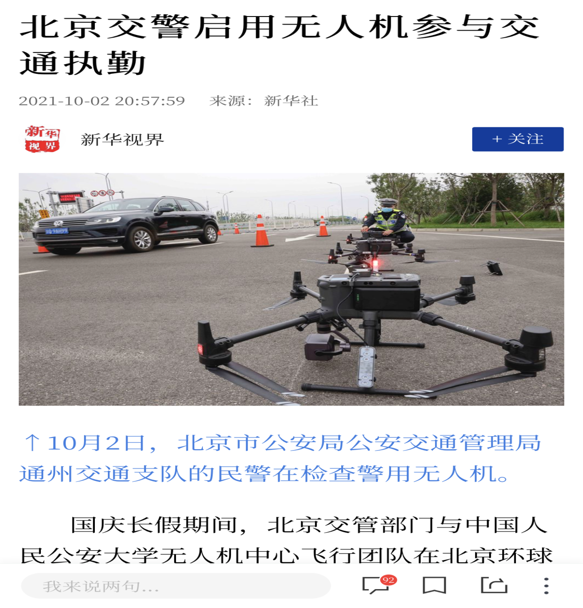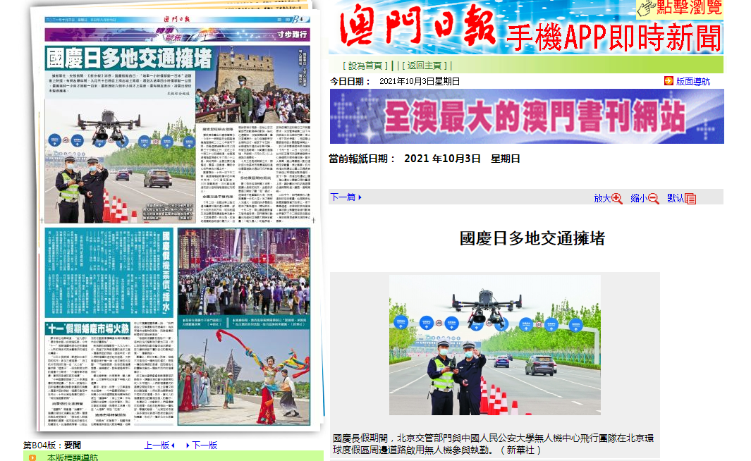 中秋国庆期间,开云无人机中心飞行团队与北京交管部门共同参与北京环球影城度假区周边道路的交通执勤。新华社、北京日报、北京电视台记者进行现场报道,人民网、新华网、光明网、中国青年网以及北京青年报、澳门日报等主流媒体纷纷对此次执勤任务进行了转载报道。
