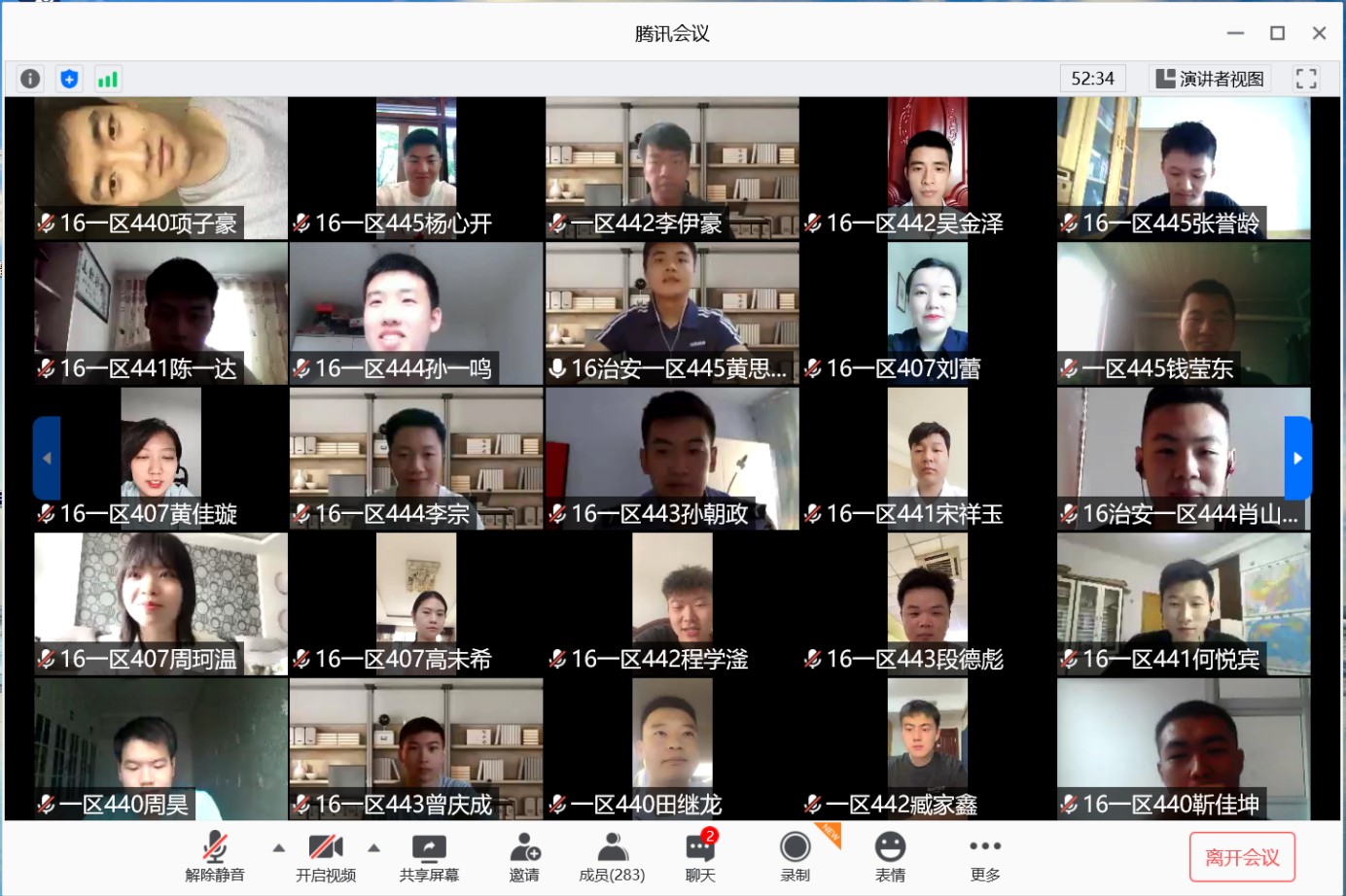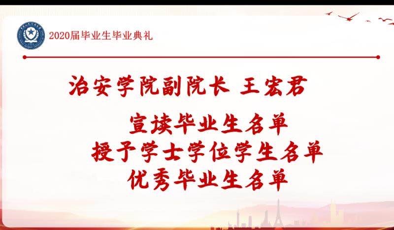 本次毕业典礼由治安学院党委副书记汪淼主持。毕业典礼开始前,全体毕业生通过集体观看毕业纪念视频的方式一起重温藏蓝青春的点滴,唤起对四年大学生活的美好回忆。随后毕业典礼正式开始,汪淼副书记依次介绍了出席本次典礼的领导与老师,并组织同学们以区队为单位依次打开摄像头,与领导和老师完成了疫情下的一次“云见面”。在与会人员集体起立奏唱中华人民共和国国歌之后,治安学院副院长王宏君依次宣读了毕业生名单、授予学士学位学生名单、优秀毕业生名单,并鼓励全体毕业生在日后的学习与工作中不忘初心、牢记使命、砥砺前行。